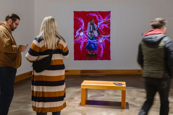 'Benny Button' by Brody Burns dances through projection-mapped animation, depicting his niece, the first powwow dancer in his family. Across the space, 'Rooted in Who I Am' by Torrie Ironstar mirrors this figure — grounded and resolute — connecting a shared story of reclaimed ancestry and cultural pride across generations.
